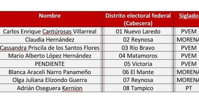 De acuerdo con la información proporcionada por el Comité Ejecutivo Nacional, las y los propietarios que encabezarán las fórmulas de la coalición “Sigamos Haciendo Historia” para contender por una diputación federal por Tamaulipas son: