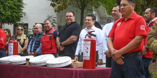 Livio Flores Rodríguez, director de Protección Civil del Municipio, acompañado del Secretario del Ayuntamiento Hugo Reséndez Silva y personal de bomberos, y agradeció el apoyo del alcalde capitalino para seguir fortaleciendo la corporación con más y mejor equipo de protección personal, atención de siniestros y rescate.